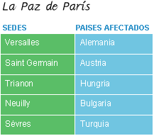 La paz se organizó siguiendo los principios del presidente norteamericano Woodrow Wilson, expuestos en sus "catorce puntos", que pretendían la retirada de las tropas alemanas de los territorios ocupados en todo el mundo, la necesidad de hacer coincidir los Estados y las naciones en Europa, lo que suponía el fin de los imperios plurinacionales, la libertad de navegación y de comercio y la creación de una "Sociedad General de Naciones" que evitase futuras guerras.
